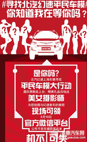 據(jù)了解,為了增強(qiáng)觀展的趣味性,北汽幻速特在4月22日-4月26日推出“尋找北汽幻速平民車!被顒(dòng)。只要在活動(dòng)期間蒞臨北汽集團(tuán)展臺(tái)與北汽幻速S2/S3現(xiàn)場(chǎng)合影,即可享受由專業(yè)攝影師為您提供的優(yōu)質(zhì)大片拍攝服務(wù),照片現(xiàn)場(chǎng)打印現(xiàn)場(chǎng)贈(zèng)送。只要您現(xiàn)場(chǎng)關(guān)注北汽幻速官方微信,即可獲得“北汽幻速最佳平民車模”的評(píng)選資格,有機(jī)會(huì)獲得iPhone6、哥倫比亞沖鋒衣等諸多大禮,中獎(jiǎng)名單將于5月通過(guò)官方微信統(tǒng)一公布。看車拍照兩不誤,輕松參與享好禮!