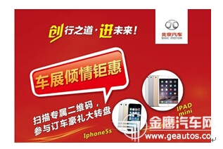一年一度的2015湖南車展熱力來襲,北京汽車針對2015湖南車展“購車鉅惠 “關(guān)注公眾號就有機會獲取500元購車基金。最高的優(yōu)惠,最驚喜的好禮都在這里,想要購車的你,絕對不需要再猶豫!  驚喜鉅惠: X65 :2.0T 渦輪增壓 9.88萬元起 震撼上市 D70 :2.3T 豪華版 現(xiàn)金直降 6萬元 再送iPadmini BJ40:2.4 5MT-酷野版 現(xiàn)金直降17000元(車展僅限三臺) D20 :冰點價49800元起 D50 :1.5CVT自動標準版 最高綜合優(yōu)惠2萬元,鉅惠價59800元起