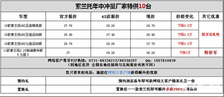 近日,金鷹汽車網(wǎng)編輯從進(jìn)口起亞湖南韓通4S店了解到,店內(nèi)購索蘭托,最高優(yōu)惠3萬元,有現(xiàn)車供應(yīng),顏色可選。感興趣的朋友可以到店咨詢購買,銷售熱線:0731-8833 6212 。