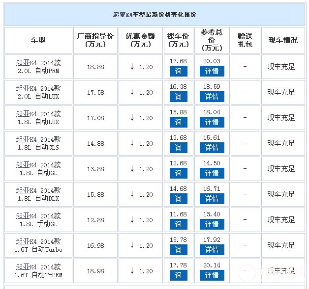 近日,本店內(nèi)起亞K4現(xiàn)車銷售,顏色可選,目前購車部分車型可優(yōu)惠1.20萬元,感興趣的朋友可以到店咨詢購買,詳情見下表: