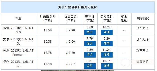近日,本店內(nèi)秀爾現(xiàn)車銷售,顏色可選,目前購(gòu)車部分車型可優(yōu)惠3.19萬元,感興趣的朋友可以到店咨詢購(gòu)買,詳情見下表:
