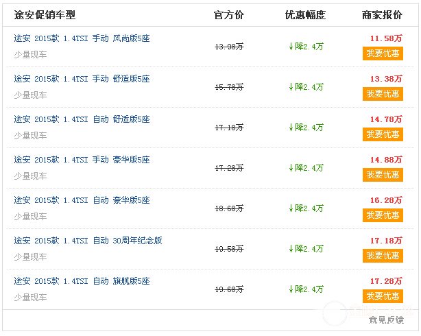 湖南世華上海大眾店內途安有少量現(xiàn)車,近期購車最高優(yōu)惠2.4萬。感興趣的朋友不妨撥打咨詢熱線0731-82832888或到店咨詢。相關車型及報價如下表: