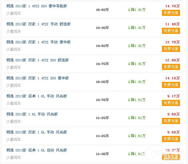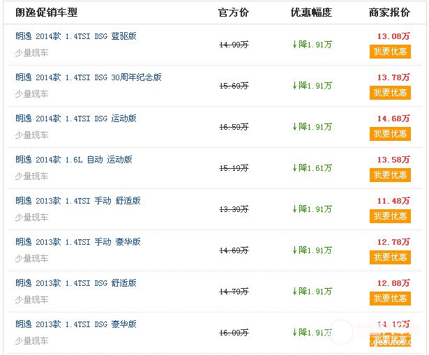 湖南世華上海大眾店內(nèi)朗逸有少量現(xiàn)車,近期購車最高優(yōu)惠1.91萬。感興趣的朋友不妨撥打咨詢熱線0731-82832888或到店咨詢。相關(guān)車型及報價如下表: