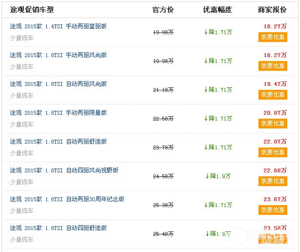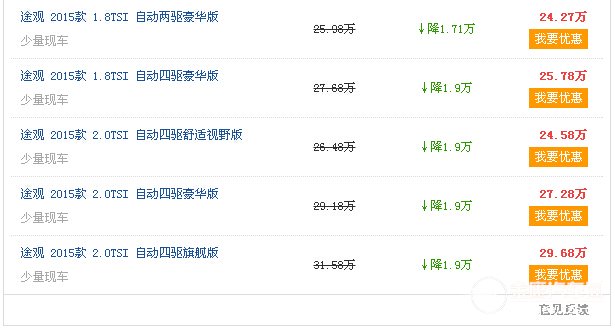 湖南世華上海大眾店內途觀有少量現(xiàn)車,近期購車最高優(yōu)惠1.9萬。感興趣的朋友不妨撥打咨詢熱線0731-82832888或到店咨詢。相關車型及報價如下表: