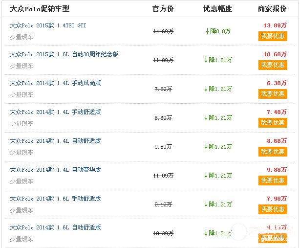 湖南世華上海大眾店內(nèi)大眾Polo有少量現(xiàn)車,近期購車最高優(yōu)惠1.21萬。感興趣的朋友不妨撥打咨詢熱線0731-82832888或到店咨詢。相關(guān)車型及報(bào)價如下表: