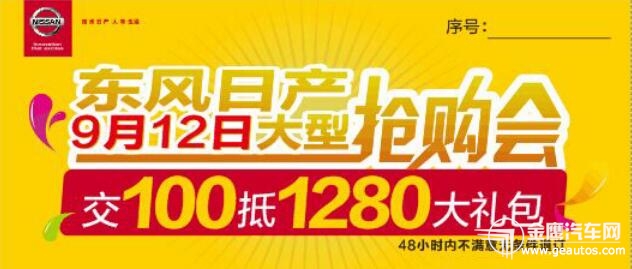 2015年9月12日上午10:00—12:00,請記住此次購車的最佳時(shí)間段,買車什么叫做便宜實(shí)惠答案就在【東風(fēng)日產(chǎn)瀏陽秋季大型搶購會】,這就是實(shí)實(shí)在在的優(yōu)惠。還看什么啊。!手機(jī)就在眼前,直接撥打0731—83217888報(bào)名,就可享受最便宜實(shí)惠的價(jià)格,還有100抵1280大禮包等你拿。