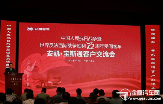 2015年9月3日,紀(jì)念中國人民抗日戰(zhàn)爭暨世界反法西斯戰(zhàn)爭勝利70周年閱兵活動在北京天安門隆重舉行,中國人民也迎來了我國歷史上的第一次勝利日大閱兵!閱兵式現(xiàn)場,作為唯一一個直接參與閱兵式的客車品牌,經(jīng)過特別改裝的敞篷版安凱寶斯通客車搭載著抗戰(zhàn)老兵方隊與我國高精尖軍事裝備同臺受閱,成功造就了中國自主品牌汽車發(fā)展史上的永恒驕傲! 為進一步揭秘受閱客車的受閱歷程和幕后故事,全方位展示安凱寶斯通客車的至臻品質(zhì),2015年9月9日,中國人民抗日戰(zhàn)爭暨世界反法西斯戰(zhàn)爭勝利70周年受閱客車安凱·寶斯通客戶交流會在北京釣魚臺國賓館盛大舉辦!會議現(xiàn)場,江淮汽車董事長安進、安凱客車董事長戴茂方等公司高層領(lǐng)導(dǎo)出席作重要講話,并與參閱的軍方領(lǐng)導(dǎo)、來自全國各省市的重點客戶代表、以及中央電視臺等核心媒體等各界精英近三百人一道,共同見證了安凱寶斯通的榮耀與喜悅!