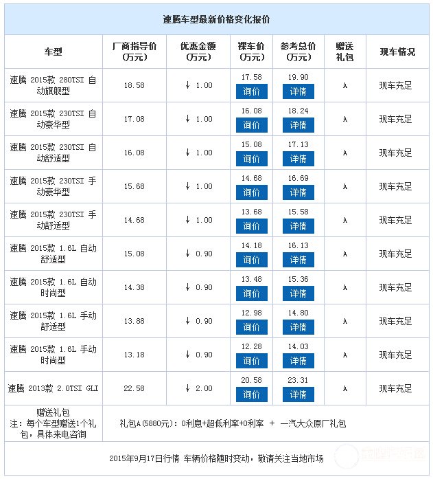 中拓瑞眾5周年店慶,盛大酬賓,全城狂歡從不玩虛的,到店即可豐獲意想不到的驚喜....速騰現(xiàn)車銷售,顏色可選,目前購車部分車型可 優(yōu)惠2萬元,額外贈(zèng)送超值豪華大禮包!感興趣的朋友可以到店咨詢購買,詳情見下表: