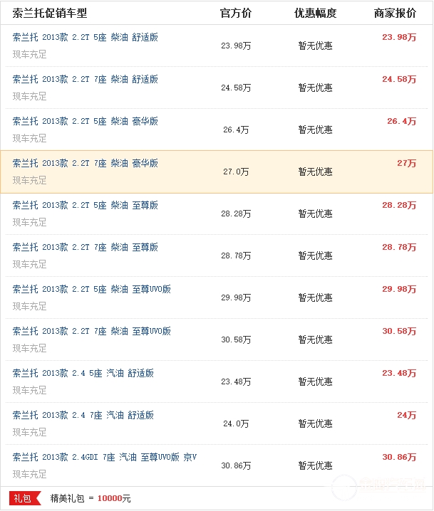 湖南順意通起亞店內(nèi)索蘭托有少量現(xiàn)車(chē),近期購(gòu)車(chē)最高優(yōu)惠1.2萬(wàn),同時(shí)贈(zèng)送價(jià)值10000元的大禮包。感興趣的朋友不妨撥打咨詢(xún)熱線0731-88290011或到店咨詢(xún)。相關(guān)車(chē)型及報(bào)價(jià)如下表: