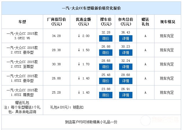 十一金融風(fēng)暴來襲,最高貸款購(gòu)車貼息6400元,成功貸款購(gòu)車更有價(jià)值3880元大禮包贈(zèng)送。近日,本店內(nèi)一汽-大眾CC現(xiàn)車銷售,顏色可選,目前購(gòu)車部分車型可優(yōu)惠2萬元,感興趣的朋友可以到店(長(zhǎng)沙縣星沙永通一汽-大眾店內(nèi))咨詢,購(gòu)車就享低率、高補(bǔ)貼、精美好禮,免費(fèi)VIP網(wǎng)銷熱線:0731-82870978