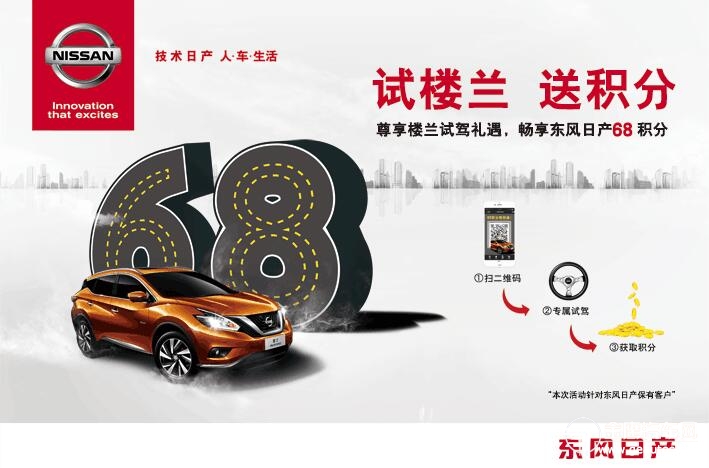 即日起,凡東風(fēng)日產(chǎn)車主均可參與“試樓蘭 送積分”活動(dòng),贏取68個(gè)禮遇積分。詳情隨詢當(dāng)?shù)貣|風(fēng)日產(chǎn)專營店,加入暢游68號(hào)公路樓蘭試駕活動(dòng)。