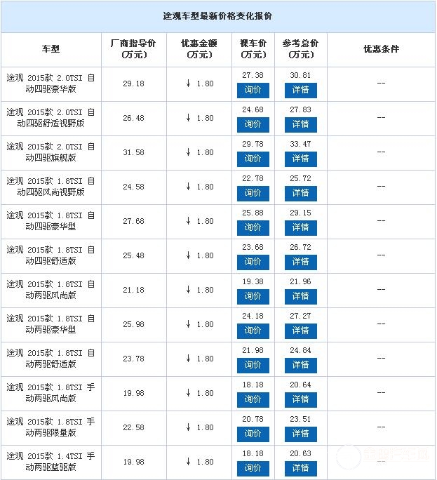 申湘上海大眾星沙眾興店內(nèi)途觀少量現(xiàn)車(chē)銷(xiāo)售,顏色可選,目前購(gòu)車(chē)可優(yōu)惠1.8萬(wàn)元,送裝飾禮包。感興趣的朋友可以到店咨詢(xún)購(gòu)買(mǎi),詳情見(jiàn)下表: