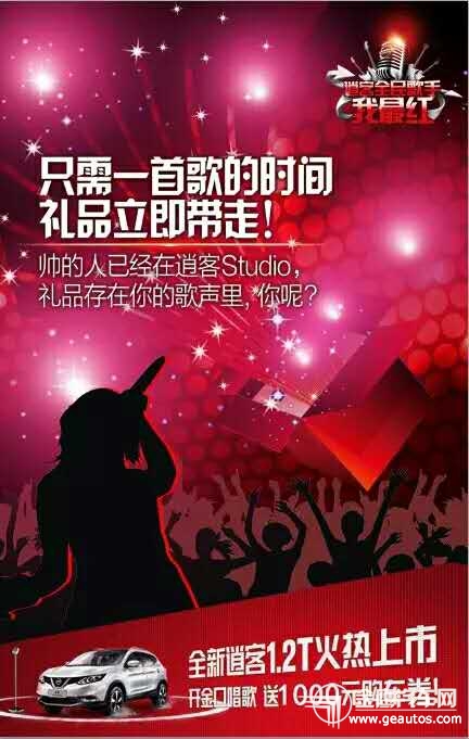 凡參與即送您千元購(gòu)車(chē)券,進(jìn)入總決賽更是有神秘大禮等您拿哦!請(qǐng)到東風(fēng)日產(chǎn)長(zhǎng)沙蘭天城南專(zhuān)營(yíng)店參與《全民歌手-我最紅》活動(dòng),我們將為你揭曉,期待打造最紅的你。