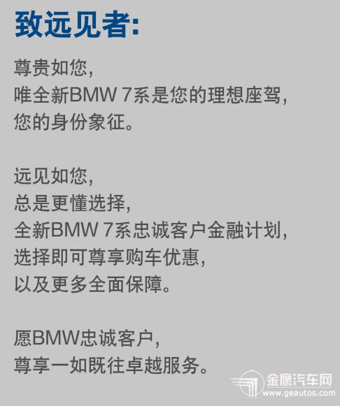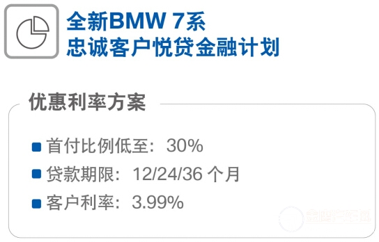 您及您近親屬所持有車輛為BMW旗下車薪,并且已通過(guò)BMW忠誠(chéng)客戶認(rèn)證。即可成為BMW忠誠(chéng)客戶。 BMW將持續(xù)為您提供更卓越的服務(wù),更貼心的產(chǎn)品和更全面的保障。  您在坐擁奢華時(shí),還能坐享輕松生活,讓奢華品質(zhì)不再成為負(fù)擔(dān),是BMW金融想要給您的生活方式。 3.99%超低利率,30% 超低首付比例,雙重減少您的生活壓力,輕松坐擁奢華品質(zhì),自如創(chuàng)造華麗未來(lái)。