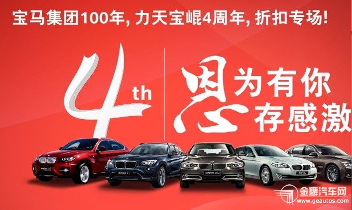 1916年起至今,寶馬歷經(jīng)百年。2016 年 3 月 7 日,寶馬迎來(lái)百年華誕。3月12日長(zhǎng)沙力天寶崐也即將迎來(lái)四周年店慶,為回饋新老BMW 客戶,力天寶崐精心準(zhǔn)備驚喜壕禮,閃耀星城!  悅行四載,因?yàn)橛心?/span> 力天寶崐4周年折扣專場(chǎng)優(yōu)惠政策: 100臺(tái)特價(jià)現(xiàn)車(chē),僅售6.8折起購(gòu)店慶指定車(chē)型送6888元BMW生活精品大禮包!BMW原廠精品最低5折起售,部分車(chē)型最低首付僅2成,最低日供僅7元!大客戶(含公牌和個(gè)人車(chē)主)購(gòu)車(chē)額外尊享最高10000元現(xiàn)金補(bǔ)貼!留學(xué)生購(gòu)車(chē)尊享免稅禮遇! 線上支付198元=尊享價(jià)值千元的機(jī)油保養(yǎng)1次+1280元SPA卡1張 支付鏈接:http://m.tm.16888.com/detail/392.html 【幸運(yùn)參與禮】:購(gòu)買(mǎi)門(mén)票客戶即可參與 “大富翁”,勁爆大禮應(yīng)有盡有! 【驚喜抓金禮】:抓多少金幣直接抵多少車(chē)款; 【砍價(jià)幫幫忙】:“砍價(jià)幫幫忙”千人幫砍活動(dòng),讓您先砍價(jià)再買(mǎi)車(chē)!史無(wú)前例的千金鉅惠千人參與砍價(jià)大比拼! 【限量搶單禮】:前28位購(gòu)車(chē)客戶即可獲得限量金猴一個(gè); 【車(chē)主店慶禮】:寶馬車(chē)主店慶專享:全車(chē)22項(xiàng)免費(fèi)檢測(cè)!機(jī)油保養(yǎng)買(mǎi)3送2!輪胎配件及工時(shí)8.5折!BMW客戶到店續(xù)保即送1500元代金券!活動(dòng)期內(nèi)入廠客戶即可參加店慶百萬(wàn)大抽獎(jiǎng)! 【趣味互動(dòng)禮】:現(xiàn)場(chǎng)參與互動(dòng)即可獲得BMW 精美禮品一份; 【重復(fù)抽獎(jiǎng)禮】:當(dāng)天購(gòu)車(chē)客戶均可參與重復(fù)抽獎(jiǎng),4K液晶電視、電冰箱、雪花瓷套裝、毛巾禮盒、BMW拉桿箱、BMW背包等BMW精品送不停!