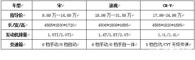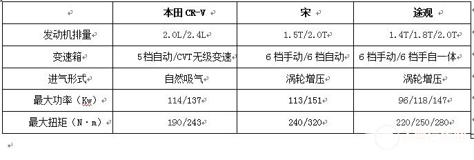 小結(jié):途觀是標(biāo)準(zhǔn)的大眾風(fēng)格,簡(jiǎn)潔實(shí)用。CR-V具備一定設(shè)計(jì)感,融合了一些流行元素。值得肯定的是,宋的設(shè)計(jì)和做工都可圈可點(diǎn),更為動(dòng)感和考究,已經(jīng)具備了叫板途觀、CR-V的實(shí)力。 動(dòng)力:宋的性能更出色 動(dòng)力系統(tǒng)方面,比亞迪宋搭載1.5TI、2.0TI兩款發(fā)動(dòng)機(jī),其中,2.0TI發(fā)動(dòng)機(jī)將廢氣渦輪增壓、缸內(nèi)直噴、雙可變氣門(mén)正時(shí)、雙平衡軸、全鋁合金發(fā)動(dòng)機(jī)五大技術(shù)完美結(jié)合,具有強(qiáng)勁動(dòng)力,兼具質(zhì)量輕、低油耗、環(huán)保等優(yōu)點(diǎn)。其擁有151kW的最大功率及320 Nm的峰值扭矩,動(dòng)力可媲美傳統(tǒng)的3.5升自然吸氣發(fā)動(dòng)機(jī)。與之匹配的6速自動(dòng)變速器,操控更平順、駕駛更輕松。 途觀搭載1.4TSI、1.8TSI以及2.0TSI三款發(fā)動(dòng)機(jī),其中1.4TSI發(fā)動(dòng)機(jī)的最大輸出功率為96kW,峰值扭矩為220Nm;2.0TSI發(fā)動(dòng)機(jī)的最大輸出功率為147kW,峰值扭矩為280 Nm。傳動(dòng)系統(tǒng)方面,與發(fā)動(dòng)機(jī)匹配的是6速手動(dòng)或6速自動(dòng)變速箱。 CR-V搭載的2.0L和2.4L自然吸氣發(fā)動(dòng)機(jī),最大功率分別為114kW和137kW,峰值扭矩為190Nm和243Nm,傳動(dòng)系統(tǒng)則匹配5速自動(dòng)變速器和CVT無(wú)級(jí)變速器。CVT無(wú)級(jí)變速箱,與舊款的5AT平行軸相比,換擋更平順、傳動(dòng)效率更高,當(dāng)然也少了幾分駕駛的激情。 小結(jié):總體來(lái)說(shuō),途觀和宋的動(dòng)力性能更為出色。作為自主品牌,比亞迪宋不僅在最大功率、最大扭矩上領(lǐng)先CR-V和大眾途觀,而且宋搭載的2.0TI發(fā)動(dòng)機(jī)已在比亞迪S7上搭載,技術(shù)成熟,擁有10萬(wàn)多保有客戶,無(wú)論是在參數(shù)還是在穩(wěn)定性上接近合資水平。