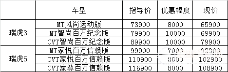 購車現(xiàn)金大禮 活動(dòng)期間,凡購買瑞虎車型的客戶,均可獲得超值現(xiàn)金大禮。其中購買瑞虎5的用戶可得到6000元現(xiàn)金大禮,購買瑞虎3的用戶可獲得7000元現(xiàn)金大禮。同時(shí)購買瑞虎5 1.5T車型還可享受國家購置稅減半的優(yōu)惠政策,而瑞虎3全系車型均可享受購置稅減半的政策,進(jìn)一步降低購車成本。
