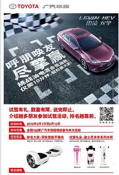 1.消費者通過網(wǎng)上預(yù)約報名試駕或直接到店,憑本人身份證及駕駛證試駕完成后,需發(fā)送與雷凌雙擎相關(guān)的信息至朋友圈,可獲得試駕禮品一份。禮品現(xiàn)場兌換,送完即止。單次中獎率100%