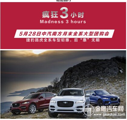 5月28日,捷豹經典吸睛之作F-PACE震撼上市,首款跑車型suv再創(chuàng)輝煌暨湖南中汽南方捷豹路虎4S中心捷豹路虎全系月末大團購,鉅惠相約。  活動主題:全新捷豹F-PACE上市會 湖南中汽南方月末大型團購會 活動時間:5月28日14:00-17:00 活動地點:湖南中汽南方捷豹路虎展廳 貴賓專線:0731 8679 8001  湖南中汽南方優(yōu)惠政策獨家享,鉅惠限時來襲!購車輕松又便捷!多重購車禮5月28日與您相約! 一、限時特價車 針對捷豹路虎品牌每個車系提供一臺廠價特價車,最高優(yōu)惠可達30萬元。 二、限時購車禮 指定時間內到店購車即可獲得價值3-10萬元專屬精品禮包。 三、限時金融“貸” 僅限于活動時間內金融貸款購指定車型0利息補貼,首付僅需20%,貸款所產生的利息由中汽南方補貼返還。 四、增值服務 1、 在中汽南方續(xù)保,即可享受商業(yè)險保費25%現(xiàn)金返還或等值高檔精品。(針對任意品牌車型) 2、活動當天專享捷豹路虎認證二手車評估師免費評估服務,任意品牌車型成功置換新車還可額外贈送常規(guī)保養(yǎng)。 以上所有優(yōu)惠政策可同時擁有,僅限5月28日14:00-17:00。  更多關于捷豹路虎的詳情請咨詢湖南中汽南方捷豹路虎4S中心 銷售熱線:0731 8679 8018 地址:長沙市星沙中南汽車世界(中南檢測站對面),歡迎蒞臨品鑒。