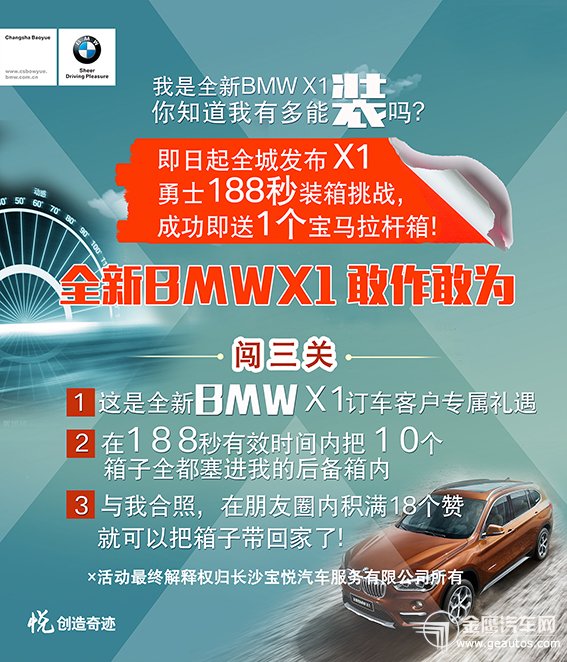 互動(dòng)送大禮。 即日起全城發(fā)布X1,勇士188秒裝箱挑戰(zhàn),成功并且集贊滿(mǎn)13個(gè)即可贈(zèng)送BMW拉桿箱一個(gè)。