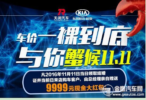 一、 活動主題:車價(jià)一裸到底 與你蟹候雙11——起亞限時(shí)秒殺金秋夜團(tuán)購會 二、 活動時(shí)間:2016年11月11日(周五)下午18:00—20:00 三、 活動地點(diǎn):中南汽車世界天潤凱達(dá)展廳 四、 報(bào)名熱線:0731-82873777 五、活動內(nèi)容: 1、 雙11有禮:來店簽到客戶贈送禮品1份; 2、 與你蟹候:來店客戶活動進(jìn)行中享受美味大閘蟹; 3、 限時(shí)秒殺:限時(shí)1小時(shí),19:00—20:00; 4、 特價(jià)限量:KX5、智跑特價(jià)車各限量10臺、K3/1臺、k5/5臺; 5、 人人有獎:每位簽單客戶均可上臺抽獎一次; 6、 多重大獎:每隔20分鐘針對簽單客戶抽取大獎一個,20:00準(zhǔn)時(shí)搖出所有簽單客戶終極大獎; 7、 天長地久:凡2016年11月11日當(dāng)日領(lǐng)取結(jié)婚證并當(dāng)前日來店購車客戶,由總經(jīng)理親自贈送9999元現(xiàn)金大紅包。 湖南天潤凱達(dá)汽車銷售服務(wù)有限公司 銷售熱線:0731-82873777 售后熱線:0731-82873889 公司地址:長沙中南汽車世界物貿(mào)路55號(H16棟)