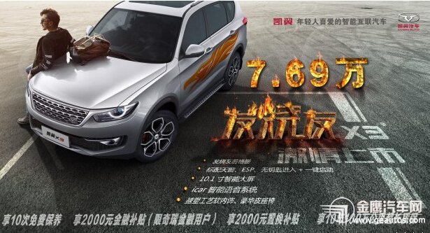 智能語控系統(tǒng) 暢爽智能互聯(lián)體驗 作為一款智能互聯(lián)SUV,凱翼X3發(fā)燒友版還具備多種智能化配置。用戶通過HCI智能語控系統(tǒng),不用動手就能實現(xiàn)車窗升降、車門上鎖、空調控制等多項功能,減少注意力分散,有效提升行車安全。依靠7寸TFT炫彩儀表屏,不僅可以快速查看各種車輛信息,還能通過與10.1寸智能大屏信息聯(lián)動,及時獲知多媒體或導航信息,無需移動視線就能查看各種信息,幫助用戶輕松駕馭,安全出行。 頂級供應商護航 高品質一如既往 動力方面,凱翼X3發(fā)燒友版搭載曾獲得全國十佳的ACTECO系列1.6L DVVT發(fā)動機,最大功率93千瓦,最大扭矩160!っ,在動力性和經濟性上均有不錯的表現(xiàn),完全滿足日常及外出行需要。懸架系統(tǒng)采用加裝穩(wěn)定桿的前麥弗遜,后雙連桿獨立懸架,同級罕見。保證車輛既能在城市道路自由馳騁,也能應對各種戶外崎嶇環(huán)境。 為保證車輛的穩(wěn)定性,凱翼X3還通過了嚴苛的高原、高寒、高溫、高濕百萬公里耐久實驗,并且整合全球優(yōu)勢資源,聯(lián)合博世、FOXCOM、VALEO、UAES、ITE、中國電信等頂 級供應商,讓用戶可以放心馳騁,自由駕馭。 凱翼X3 于2016年6月20日全國上市,目前在售的車型包括MT和CVT版本在內的智聯(lián)I至智聯(lián)V,共計9款車型,已經創(chuàng)下了2.1萬的銷售量,在銷量不斷走高的同時,凱翼X3的品質也是深受車主好評。在汽車之家的口碑調研中,凱翼X3以4.88分的高分獲得綜合口碑第一名,并在動力、操控、油耗、性價比、外觀和內飾等6項均獲得第一名,擊敗了眾多老牌自主品牌的熱銷車型,如此上佳的成績是消費者對于產品品質認可的最 佳佐證。考慮到消費者對于個性化的需求, 凱翼X3發(fā)燒友版重磅來襲,從顏值到配置等多個角度大幅升級。相信發(fā)燒友版凱翼X3定能引燃A級SUV市場,成為車市黑馬。 凱翼汽車長沙泰盈4S店期待您的光臨!我們將為您提供熱忱優(yōu)質的服務! 凱翼智能汽車湖南第一經銷商長沙泰盈店 0731-88769566 主店:長沙市岳麓區(qū)岳麓大道741號開 瑞凱翼店(西二環(huán)橋下郁金香建材市場東門對面) 分店:長沙星沙中南汽車城時中路E廣場E02棟開 瑞凱翼店