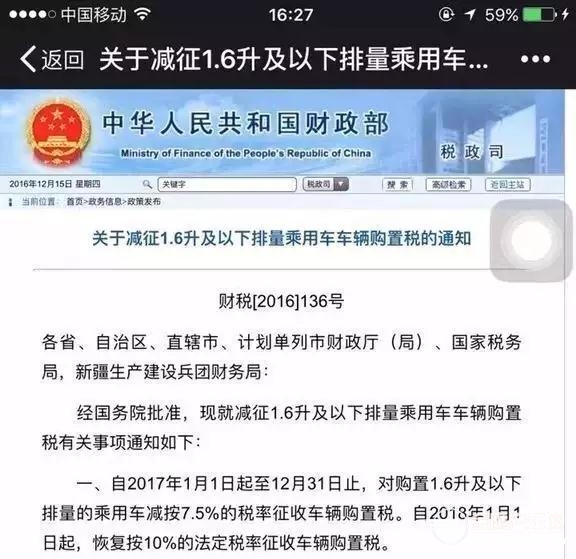 因為再過幾天,實行了一年多的1.6L及以下排量購置稅減半政策將正式到期了。據(jù)有財政部官網(wǎng)公示,這一項政策將在2017年調(diào)整為收7.5%的稅,2018年恢復(fù)至10%。