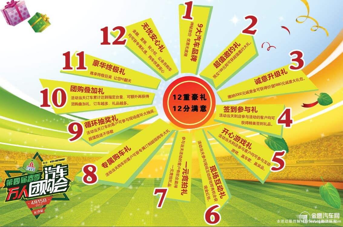 本次團(tuán)購(gòu)也將延續(xù)歷屆團(tuán)購(gòu)大手筆、大優(yōu)惠的活動(dòng)力度,接下來(lái)就為大家介紹本次團(tuán)購(gòu)12大亮點(diǎn): 1、9 大汽車(chē)廠商與九城集團(tuán)聯(lián)手神秘放價(jià)JEEP、克萊斯勒、道奇、 菲亞特、進(jìn)口現(xiàn)代、東風(fēng)悅達(dá)起亞、別克、雪佛蘭、斯柯達(dá)9大汽車(chē)廠商與九城集團(tuán)聯(lián)手現(xiàn)場(chǎng)神秘放價(jià),僅限2小時(shí); 2、超值邀約禮預(yù)交 199元即可獲超值邀約大禮; 3、誠(chéng)意升級(jí)禮繳納2000元誠(chéng)意金可獲得價(jià)值5880元誠(chéng)意大禮包; 4、簽到參與禮活動(dòng)當(dāng)天到店參與活動(dòng)的客戶(hù)均可獲得精美簽到禮品; 5、開(kāi)心游戲禮活動(dòng)當(dāng)天到店參與活動(dòng)的客戶(hù)均可參與互動(dòng)游戲,贏車(chē)款、贏獎(jiǎng)品; 6、現(xiàn)場(chǎng)互勱禮活動(dòng)當(dāng)天參與現(xiàn)場(chǎng)互動(dòng)游戲即有機(jī)會(huì)獲現(xiàn)金紅包; 7、一元競(jìng)拍禮參與當(dāng)天活動(dòng)的客戶(hù)有機(jī)會(huì)贏得一元競(jìng)拍禮品; 8、專(zhuān)屬購(gòu)車(chē)禮活動(dòng)當(dāng)天購(gòu)車(chē)的客戶(hù)可獲專(zhuān)屬訂制超級(jí)購(gòu)車(chē)大禮; 9、循環(huán)抽獎(jiǎng)禮活動(dòng)當(dāng)天訂車(chē)的客戶(hù)可參與現(xiàn)場(chǎng)連環(huán)大抽獎(jiǎng),超值放送不停歇; 10、團(tuán)購(gòu)疊加禮活動(dòng)當(dāng)天訂車(chē)?yán)塾?jì)達(dá)到指定臺(tái)量,可額外再獲得團(tuán)購(gòu)疊加禮,訂車(chē)越多,禮品越多。 11、豪華終極禮活動(dòng)當(dāng)天訂車(chē)的客戶(hù)可參與現(xiàn)場(chǎng)連環(huán)大抽獎(jiǎng),超值放送不停歇; 12、無(wú)憂安心禮金融 、置換、轉(zhuǎn)介紹、公務(wù)員購(gòu)車(chē)均可獲專(zhuān)屬禮遇,購(gòu)車(chē)悅意安心。  心動(dòng)不如行動(dòng),趕緊來(lái)電咨詢(xún)吧! 湖南九城德眾斯柯達(dá) 4S店 銷(xiāo)售熱線:0731-89772766 地址:長(zhǎng)沙岳麓區(qū)含浦大道與云棲路交匯處(猴子石大道西行2公里)