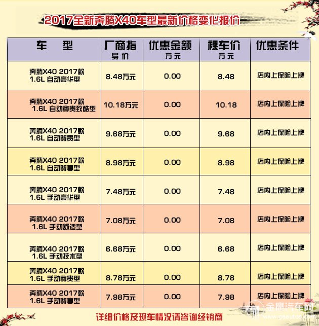 2017年3月奔騰X40全新上市,這款車型搭載D-Life全語音智能互聯(lián)系統(tǒng),會(huì)策,會(huì)聊,會(huì)說,會(huì)唱,會(huì)導(dǎo)航,是個(gè)說唱小能手哦。價(jià)格也非常具有吸引力,最低售價(jià)僅6.68萬元起,售價(jià)區(qū)間為6.68-10.18萬元。作為一款大尺寸互聯(lián)SUV,奔騰X40是奔騰品牌全系第一款的車型,憑借超越競品的商品優(yōu)勢和智能互聯(lián)的獨(dú)特魅力。一汽奔騰湖南瑞思店內(nèi)奔騰X40少量現(xiàn)車供應(yīng),按揭客戶首付50%享兩年免息,還享有廠家置換政策,對(duì)奔騰X40感興趣的朋友趕緊到店搶購吧。搶購專線:85478811,地址:星沙三一路118號(hào)!
