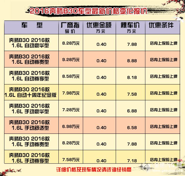 奔騰B30采用了中國(guó)一汽4GB系列高性能發(fā)動(dòng)機(jī),1.6L轎車黃金排量兼顧高動(dòng)力性及經(jīng)濟(jì)性,同時(shí)與其配合的是先進(jìn)的愛信全新六速手自一體變速箱,在不失駕控樂趣的同時(shí)更加經(jīng)濟(jì)節(jié)能,保證駕駛者始終擁有自由馳騁的完美體驗(yàn)。作為品質(zhì)家轎,奔騰B30做到了“家庭用車”與“樂享駕控”的平衡。以上為車型資料信息,本店提供了多項(xiàng)增值服務(wù),保險(xiǎn)上牌一條龍服務(wù),感興趣的朋友歡迎來(lái)電咨詢。優(yōu)惠購(gòu)車,就在一汽奔騰湖南瑞思4S店! 湖南瑞思全體員工期待您的光臨! 主營(yíng)車型:奔騰X80、奔騰X40、奔騰B90、奔騰B70、奔騰B50、奔騰B30 地址:長(zhǎng)沙星沙三一路118號(hào)(中南汽車 世界上三一路過跨線橋即到) qq購(gòu)車專號(hào):1160267556 公眾賬號(hào):hunanruisi 官方微博:http://weibo.com/bentengruisi