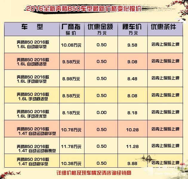 五月,溫暖的春天已離我們漸漸的遠(yuǎn)去,但是湖南瑞思的優(yōu)惠促銷力度卻越來越大。一汽奔騰B50僅售8.18萬起,最高尊享24期零利息貸款購車,一張身份證即可輕松放款。奔騰B50澎湃動(dòng)力,只為超越更好的自己,1.4T黃金排量 發(fā)動(dòng)機(jī)啟停。 得應(yīng)于精準(zhǔn)調(diào)教以及隱藏自身中的運(yùn)動(dòng)基因,讓B50有著卓越的操控表現(xiàn)。其次。全新奔騰B50優(yōu)惠現(xiàn)金5000元,按揭享低首付和高額貼息政策,二手車置換再享千元補(bǔ)貼。搶購專線:85478811,地址:星沙三一路118號(hào) 奔騰B50是一汽轎車基于全新B級(jí)車平臺(tái)——M2平臺(tái)打造而成的一款高顏值全尺寸超級(jí)家轎,作為一汽奔騰十周年推出的重磅車型,不僅具有高顏值、大空間,同時(shí)比肩B級(jí)車的越級(jí)配置和良好性能打造出動(dòng)力強(qiáng)、操控強(qiáng)和安全強(qiáng)的三強(qiáng)實(shí)力。全新奔騰B50搭載的4GB系列1.6L和1.4T高性能發(fā)動(dòng)機(jī),與豪華B級(jí)車相媲美的懸掛系統(tǒng)以及豐富的主被動(dòng)安全配置,使其在舒適性、操控性、穩(wěn)定性、安全性等方面均有十分優(yōu)秀的表現(xiàn)。這些領(lǐng)先同級(jí)的先進(jìn)技術(shù)和智能配置,讓消費(fèi)者充分感受到全新奔騰B50“超越自我、超越同級(jí)”的獨(dú)特魅力。優(yōu)惠購車,就在一汽奔騰湖南瑞思4S店! 湖南瑞思全體員工期待您的光臨! 主營(yíng)車型:奔騰X80、奔騰X40、奔騰B90、奔騰B70、奔騰B50、奔騰B30 地址:長(zhǎng)沙星沙三一路118號(hào)(中南汽車 世界上三一路過跨線橋即到) qq購車專號(hào):1160267556 公眾賬號(hào):hunanruisi 官方微博:http://weibo.com/bentengruisi |