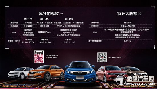近日,Qoros觀致汽車、北京能量公司、騰訊視頻聯(lián)合宣布,共同推出《瘋狂的觀致》汽車直播秀節(jié)目,引發(fā)了業(yè)界和媒體的關(guān)注,同時明星大咖和價值百萬的豪車等誘惑,也吸引了全國各地網(wǎng)友的關(guān)注。伴隨7月26日《瘋狂的觀致》首場直播開啟,業(yè)界第一個整合媒體與網(wǎng)絡(luò)平臺、開創(chuàng)電商+直播購車欄目的汽車廠家——Qoros觀致汽車,即將以融合娛樂、銷售、品牌傳播于一體的新玩法,奏響2017年品牌營銷風(fēng)暴最激情的開篇。 作為中國新高端品牌的開拓者和引領(lǐng)者,Qoros觀致汽車聯(lián)動全國的區(qū)域經(jīng)銷商,并提供誠意十足的商務(wù)政策,通過構(gòu)筑“互聯(lián)網(wǎng)直播+線下互動”創(chuàng)意營銷平臺,增強與年輕用戶的粘性,幫助他們了解觀致汽車產(chǎn)品,提升觀致品牌的知名度。整個活動將從7月26日起,持續(xù)3個月之久。首站主要覆蓋東三省及內(nèi)蒙區(qū)域,并推出區(qū)域限時優(yōu)惠。其它地區(qū)的小伙伴不用著急喲,這樣的活動與優(yōu)惠會陸續(xù)在各區(qū)域推出。  你知道《瘋狂的觀致》是什么嗎? 《瘋狂的觀致》由每周3場直播與周五1場錄播的《瘋狂大爬梯》組成,高潮部分是國內(nèi)首個全家總動員汽車益智挑戰(zhàn)類節(jié)目——《瘋狂大爬梯》。節(jié)目將提供優(yōu)質(zhì)內(nèi)容與精彩比拼,更擁有明星大咖助陣與百萬豪車誘惑,是不是hin心動呢?快跟上《瘋狂的觀致》的播出節(jié)奏,一起成為人生贏家!  怎么玩?秘籍在這里—— 6月28日起至活動結(jié)束,全民均可報名參與《瘋狂的觀致》,觀致訂購者更有機會參與《瘋狂大爬梯》節(jié)目錄制,答題沖關(guān),爭奪百萬豪車!知名網(wǎng)紅、當(dāng)紅明星輪番上陣,百萬豪車靜候歸屬,重重豪禮目不暇接——這來自觀致的盛夏魔盒即將解鎖……  看完這段你就知道闖關(guān)有多簡單 擔(dān)心闖關(guān)挑戰(zhàn)太燒腦?莫方,《瘋狂大爬梯》題目老少咸宜,簡單有趣。囊括生活娛樂五花八門的好玩問題,將以圖片、視頻、聲音等多種形態(tài)呈現(xiàn),難度不大卻能讓你發(fā)現(xiàn)樂趣。例如: 1.《三字經(jīng)》中“子不學(xué)“的下一句是什么? 2.下列明星中哪位沒有拍過《仙劍奇?zhèn)b傳》系列影視劇? 3.網(wǎng)絡(luò)用語中“胖次“是什么意思? …… 這么好玩還能拿大獎的游戲,快來呼朋喚友一起參與吧,現(xiàn)場開走一輛獎品車so easy! 詳情請咨詢當(dāng)?shù)亟?jīng)銷商:0731-88938988
