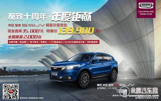 觀致5 SUV送你“6重好禮” 到店享好禮:到店即有驚喜好禮相送,決不讓你空手而歸。 全國特惠價(jià):觀致5 SUV明星車型現(xiàn)金直降3萬5,全國限量2000臺。 兩年零利率:購買觀致5 SUV可享受兩年零利率超惠金融政策。 購車零憂慮:區(qū)域“零憂慮”交車,售后服務(wù)“零憂慮”。 6年質(zhì)保:觀致5 SUV卓越6年10萬公里整車質(zhì)保,自信源自品質(zhì)! 增購換購好禮:觀致、奇瑞、奇瑞捷豹路虎車主,增購換購觀致5 SUV,可獲贈價(jià)值1888元專屬運(yùn)動踏板一套。 你以為這樣就夠了?NO!活動期間,購買觀致汽車還有機(jī)會參加“瘋狂大爬梯”,答題闖關(guān)開走價(jià)值100萬元人民幣的豪車,再加上區(qū)域“零憂慮”交車,售后服務(wù)“零憂慮”的完美保障,空前優(yōu)惠誘惑力十足! 觀致汽車銷售及網(wǎng)絡(luò)開發(fā)執(zhí)行副總裁曹志綱表示:今年是觀致十周年,自4年前開始推出新車以來,觀致始終堅(jiān)持正向研發(fā),作為中國新高端汽車品牌的引領(lǐng)者,為了紀(jì)念和感恩,觀致汽車舉辦了“觀致十周年感恩鉅獻(xiàn)”活動,推出了史無前例的優(yōu)惠。