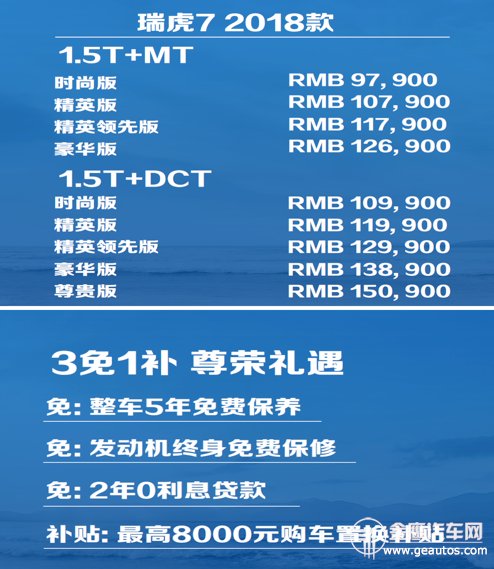 11月11日,金鷹汽車網(wǎng)編輯獲悉,在奇瑞“WWW+計(jì)劃”戰(zhàn)略發(fā)布會(huì)上,奇瑞重磅宣布瑞虎7 2018款全新上市,推出1.5T-6MT\DCT共9款車型,官方售價(jià)9.79—15.09萬元,同時(shí)發(fā)布了“三免一補(bǔ)”新車購(gòu)車權(quán)益。