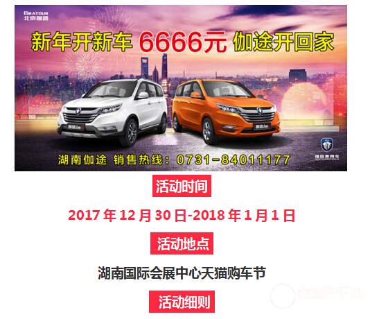 現(xiàn)在 你在起點 家在終點 沒有票根 只要握著方向盤 奔向家的方向  離2018年2 月16日農歷新年還剩8周 您,準備好開新車回家過新年了嗎? 您,因為猶豫錯過了多少次車展呢? 您,因為糾結錯過了多少次團購呢? 這一次,我們讓您在2018年來臨之際不再留有遺憾! 年前最后1個大型車展  1、簽到有禮:到店簽到享送精美禮品一份 2、訂車抽獎禮:訂車砸金蛋,家電,保養(yǎng),油卡等豐富好禮送不停 3、訂車禮:所有訂車客戶網(wǎng)上下單享500-1000元油卡 4、輕松車貸禮:新年新車6666元伽途新車開回家, 金融貸款補貼2000元, 5、置換禮:新年開新車,伽途4.19萬起,置換最高10000元補貼 6、保修禮:購北京伽途享十年二十萬公里超長保修 活動期間內購車更是直升福田汽車VIP會員,專享各項優(yōu)惠服務。可無限次數(shù)參加車友會活動,洗衣機、微波爐、電飯煲等大禮100%送出!還在等什么呢?送給今年給力的自己,讓伽途溫暖你回家的路! 本店充沛貨源,優(yōu)質服務、快速提供購車貸款上牌一條龍服務,一日內完成(車價+購置稅+保險均可享受二成按揭)。提供30公里免費接送,享受茶水、免費中餐、免費wifi等便利服務,服務熱線:0731-84011177!