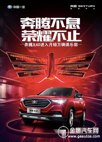 車型簡介: 大尺寸互聯(lián)SUV-奔騰X40自去年3月上市以來,憑借著高顏值和內(nèi)涵,以及自己擁有的獨(dú)特亮點(diǎn)—D-Life智控系統(tǒng),受到市場廣泛歡迎。而在剛剛過去的17年,奔騰X40月銷量已經(jīng)突破一萬輛的事實(shí)也驗(yàn)證了它的卓越實(shí)力。上市周年之際,隆重推出了一汽奔騰X40網(wǎng)紅版,該車?yán)^承了奔騰家族安全強(qiáng)、空間大等優(yōu)秀基因,在配置方面進(jìn)行了增配升級。奔騰X40網(wǎng)紅版搭載一汽奔騰D-Life 2.0互聯(lián)智控系統(tǒng)。消費(fèi)者使用手機(jī)APP即可開啟發(fā)動(dòng)機(jī)、車鎖、近光燈,提前設(shè)置空調(diào)溫度、對主副駕駛座椅進(jìn)行加熱等!败囕v診斷”功能支持發(fā)動(dòng)機(jī)管理系統(tǒng)等多項(xiàng)子系統(tǒng)診斷。在車機(jī)端,可以全語音控制調(diào)節(jié)空調(diào)、加熱后風(fēng)窗或座椅,諸多功能只需一句話,分分鐘就能搞定。
