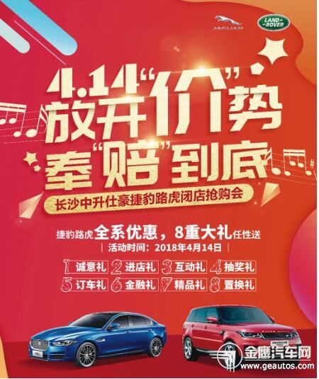 一、【誠意禮】 預(yù)繳165元 享受 新車提車底盤裝甲 專用行車記錄儀 三年兩次車內(nèi)皮革養(yǎng)護(hù) 不限次數(shù)洗車  二、【進(jìn)店禮】 進(jìn)店即送捷豹路虎鑰匙扣一個 三、【訂車禮】 訂車即可獲贈捷豹路虎拉桿箱一個 四、【抽獎禮】 當(dāng)天訂車可參與需3輪循環(huán)抽獎 獎品有品牌掃地機(jī)器人,品牌空氣凈化器,品牌車載冰箱,寶石項(xiàng)鏈,帳篷, 捷豹路虎手表,捷豹路虎自行車,捷豹路虎背包等。 五、【互動禮】 活動期間訂車即可參與游戲互動,禮品有捷豹路虎保溫杯,捷豹路虎雨傘,捷豹路虎打火機(jī),捷豹路虎保溫杯,捷豹路虎U盤等 六、【置換禮】 免費(fèi)二手車評估,置換補(bǔ)貼高達(dá)5000元,送交強(qiáng)險(xiǎn),車船稅 七【金融禮】 發(fā)現(xiàn)神行、攬勝極光及捷豹XFL享受“0”利息金融政策 八、【精品禮】 捷豹路虎精品專享8.5折優(yōu)惠 瘋搶兩小時(shí),大禮送不停! 全系車型享春季超低廠家優(yōu)惠價(jià)! 價(jià)格夠美麗!禮品夠豐厚! 您還有什么理由不來?! 抓緊時(shí)間報(bào)名吧 0731-88399888