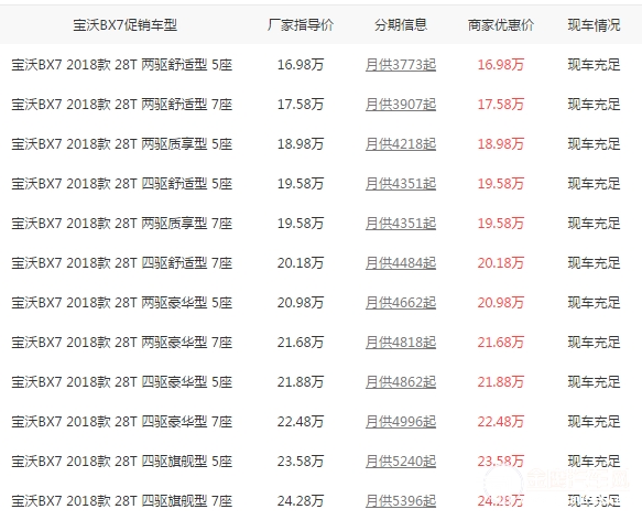 【感謝關(guān)注寶沃汽車湖南煜嶠冠軍店】1. BX7 20萬 5/7座 任選寬體SUV,是寶沃的旗艦車型,BX7適合家庭用戶,兼具SUV通過性、 MPV大空間、 Fastback操控性、轎車舒適性的全能車型。在德系車傳統(tǒng)優(yōu)勢“動力、安全” 方面做到了全面超越。 BX7 配備了 2.0T 直噴渦輪增壓發(fā)動機,瀚德第 5代全時智能四驅(qū),提供純正的德系操控感受。安全方面, BX7 擁有同級最強車身,高強度鋼使用比例高達79%,關(guān)鍵區(qū)域鋼板強度高達 1500Mpa,配合同級最全面的 16 項 B-Safe 主動安全功能,全面保障您和家人的駕乘安全。 而且,寶沃為 BX7 車主提供了行業(yè)首創(chuàng)的終身質(zhì)保服務(wù),讓您用車無憂。2. 寶沃BX7搭載2.0T發(fā)動機,2016款售價16.98-24.18萬,2018款售價:16.98-32.68萬。3. 在售車型首付低至3.4萬,尊享36期0利率等多重金融分期政策。4. 目前店內(nèi)2016款BX7正在熱銷中,活動優(yōu)惠大。TS高性能車型接受預(yù)定中。6. 凡老客戶介紹新客戶購BX5,老客戶均送1000元油卡或代金券。7. 凡通過該促銷到店購車,尊享低于展廳來店1000元優(yōu)惠。購寶沃汽車,到全國銷售、售后服務(wù)雙冠軍店!