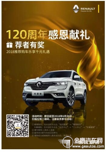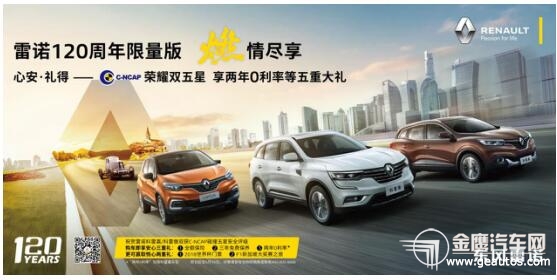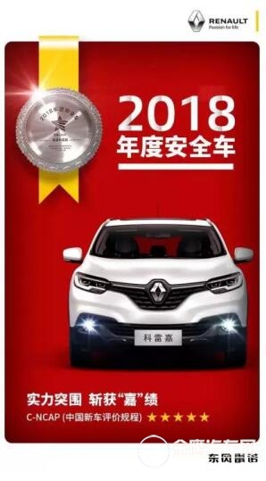 祝賀雷諾科雷嘉/科雷傲雙獲C-NCAP碰撞五星安全評價,購車即享安心三重禮:全額保險、三年免費保養(yǎng)、兩年0利率;還可贏取悅心兩重禮:2018世界杯門票、F1新加坡大獎賽之旅;