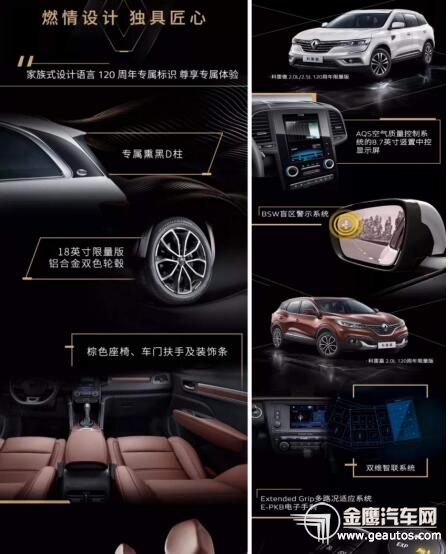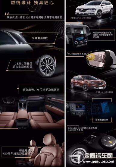 “雷諾SUV家族120周年限量版”車型,共計四款產品,官方指導價14.98萬-22.28萬元。限量版車型在全新一代科雷傲、科雷嘉和卡繽成功的基礎上打造,以燃情設計、燃心科技及燃享價值為消費者打造尊崇專享的出行體驗。