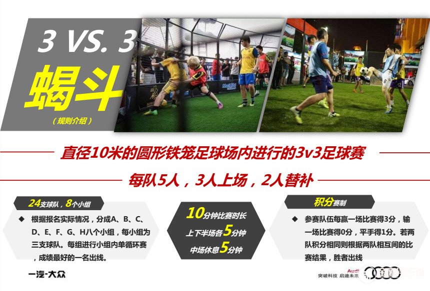 一汽-大眾奧迪將于2018年6月9日-6月10日,在長(zhǎng)沙開(kāi)福萬(wàn)達(dá)廣場(chǎng),為熱情球迷打造一場(chǎng)專(zhuān)屬足球賽事活動(dòng)——“2018奧迪A3南方車(chē)型鐵籠足球嘉年華”。在嘉年華活動(dòng)中,最為閃耀的就是“鐵籠足球爭(zhēng)霸賽”。賽事采用獨(dú)特創(chuàng)新的足球體驗(yàn)方式,比賽場(chǎng)地是獨(dú)特的直徑10米的圓形籠式競(jìng)技場(chǎng),球場(chǎng)不設(shè)邊界,繼承鐵籠足球傳統(tǒng)的3V3蝎斗模式,球員在激烈的肉搏中,體驗(yàn)最原始、最熱血的足球;籠中搏斗,唯強(qiáng)者勝出!