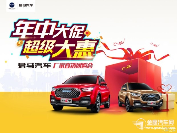 大尺度禮遇享不停 一重專屬簽到禮品 在活動期間,所有到店客戶均可獲得精美簽到禮品一份 二重試駕體驗禮 在活動期間,所有到店留資并進行試駕的用戶都可獲得君馬汽車專屬禮品 三重集贊人氣禮 活動期間到店客戶與君馬S70合影,發(fā)布朋友圈集贊18個可獲得精美zipai桿一個,集贊28個可獲得小豬佩奇一個,集贊58個可獲得抖音花一個 四重個貸金融禮 一證貸首付3成18期0利率,此外還有首付2成,無戶籍限制,還送三年盜搶保障 五重置換禮 凡是名下有任意汽車產(chǎn)品(藍牌),且舊車擁有時間6個月以上,在用戶提出舊車置換需求后,提交置換驗收所需材料,完成舊車交易過戶,享受君馬S70全系車型,超值置換補貼5000元/臺 六重購車禮 某網(wǎng)線上交一元定金到店即可享受2000元購車優(yōu)惠,現(xiàn)場訂車用戶即可獲得價值人民幣3999元訂車大禮包一份,并可參與現(xiàn)場砸金蛋抽獎,豪禮多多,大禮等你帶回家。 年中大促篇:“利度大開,等您來嗨” 6月23日/24日,“年中大促、超級大惠”—君馬汽車廠家直銷團購會活動,到店有禮、購車有禮,別管大禮小禮來就有機會獲禮,現(xiàn)場活動還有“趣味潮嗨樂翻天”的開場表演、現(xiàn)場抽獎、互動游戲。廠家直銷價的購車盛會,機會難得,不容錯過!