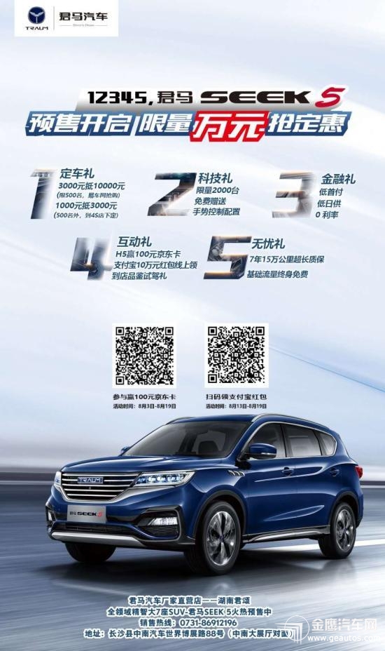 相信你已經(jīng)對TA很熟悉了 整體造型剛?cè)峥∫菔荰A 森系典雅精致內(nèi)飾是TA 國內(nèi)自主品牌中 首款搭載智能手勢交互系統(tǒng)的是TA 動力強勁、安全配置豐富的也是TA 沙漠、草地、高山、城市、涉水 全領(lǐng)域掌控的更是TA  12345 君馬SEEK 5 全領(lǐng)域精智大7座SUV真的來了 我們特意為您準備了 預(yù)售開啟 限量萬元搶定惠活動  1 定車禮 2018年7月30日——8月19日 用戶在易車惠SEEK 5活動專題頁 下單購車券 在有效期內(nèi)到4S店交3000元定金 購買君馬SEEK 5 1.5T 6MT領(lǐng)智版、 1.5T 6AT(領(lǐng)尚版、領(lǐng)智版、領(lǐng)耀版) 即可享受交3000元抵10000元的優(yōu)惠 傳送面在下面 每天上午9:00準時開搶 每日限額發(fā)放,共500個名額 搶不搶得到全憑手速 還不趕緊練練~ 搶到的大家必須留下真實姓名 手機號碼和購買意向城市 成功下單并收到短信即為搶到購車券 必須在成功下單5天內(nèi) 到4S店交3000元定單 過期優(yōu)惠卷視為無效喔 2 科技禮 限量2000臺 免費贈送手勢控制配置  3 金融禮 低首付 低日供 0利率  4 互動禮 H5贏100元京東卡 支付寶10萬元紅包上線領(lǐng) 到店品鑒試駕禮 請密切關(guān)注君馬汽車官方微信 近期將發(fā)布本重好禮詳細信息 參與贏100元京東卡 (活動時間:8月3日-8月19日) 掃碼領(lǐng)支付寶紅包 (活動時間:8月13日-8月19日) 5 無憂禮 7年15萬公里超長質(zhì)保 移動基礎(chǔ)流量終生免費  就是要快快快 快搶快留快下定 5重大禮享不停