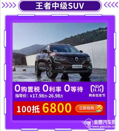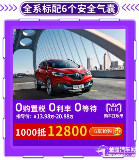 1.到店禮:進(jìn)店即可獲贈(zèng)精美禮品一份 2.預(yù)交返還禮:預(yù)交100抵6800、預(yù)交500抵9800、預(yù)交1000抵12800 3.特批車(chē)禮:活動(dòng)當(dāng)天,廠家30臺(tái)特批車(chē),資源有限,限購(gòu)先得 4.搶單禮:前5名訂車(chē)客戶,即可尊享好禮一份 5.置換/增購(gòu)禮:雷諾老車(chē)主,額外尊享10000元置換/增購(gòu)補(bǔ)貼 6.金融禮:尊享0購(gòu)置稅、0利率、0等待 東風(fēng)雷諾 科雷傲  東風(fēng)雷諾 科雷嘉  整車(chē)原裝進(jìn)口 卡繽