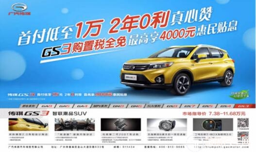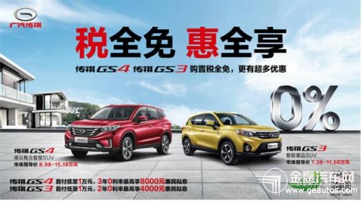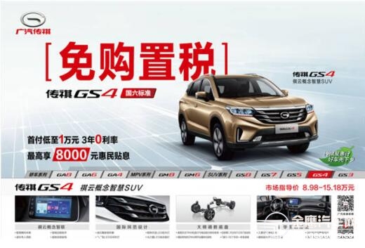 不久前,國家相關(guān)部門發(fā)布關(guān)于增值稅稅率調(diào)整通知,將汽車制造業(yè)稅率由原來的16%下降到13%。廣汽傳祺積極響應(yīng)國家號(hào)召,自4月1日起,率先推出全新傳祺GS4、傳祺GS3購置稅全免政策,將國家經(jīng)濟(jì)改革的企業(yè)發(fā)展紅利,實(shí)實(shí)在在補(bǔ)貼給所有購車用戶。  更值得關(guān)注的是,此次廣汽傳祺推出的史無前例的優(yōu)惠活動(dòng),以“春暖萬元購車季”為主題,推出定制化升級(jí)優(yōu)惠政策,精準(zhǔn)指向了新時(shí)代用戶的消費(fèi)升級(jí)需求。以全新傳祺GS4為例,消費(fèi)者可同步獲得補(bǔ)貼升級(jí)與金融升級(jí)雙重禮遇,購車即可享購置稅全免與首付低至1萬元,3年0利率最高享8000元惠民貼息政策。誠意滿滿的補(bǔ)貼組合拳,大幅降低購車門檻。 車型 全新傳祺GS4 傳祺GS3 補(bǔ)貼升級(jí)免費(fèi)贈(zèng)送購置稅 金融升級(jí)首付低至1萬元 3年0利率最高享8000元惠民貼息首付低至1萬元 2年0利率最高享4000元惠民貼息 (詳情請(qǐng)咨詢廣汽傳長沙經(jīng)銷商) 購置稅全免 傳祺GS4首付1萬 最高貼息8000元 如今首付一萬即可入手的傳祺GS4變得更加觸手可得。三年零利率,最高8000元的貼息政策更是主動(dòng)為客戶減輕購車負(fù)擔(dān)。而更值得為這款產(chǎn)品動(dòng)容的是它領(lǐng)先同級(jí)的“冠軍品質(zhì)”。自2015年上市以來,傳祺GS4在中國SUV市場(chǎng)樹立了多項(xiàng)銷售記錄與口碑標(biāo)桿,它以高品質(zhì)換取市場(chǎng)與口碑,快速成長為10萬級(jí)國民SUV熱門車型。  據(jù)統(tǒng)計(jì),全新傳祺GS4僅僅用了41個(gè)月的時(shí)間,累計(jì)銷量就突破100萬輛,成為最快達(dá)到這一成績的中國品牌SUV。不僅如此,它在J.D. Power中國新車質(zhì)量研究(IQS)報(bào)告中,曾連續(xù)兩年奪得中國品牌緊湊型SUV新車質(zhì)量第一名。今年年初,更是一舉斬獲了中國品牌緊湊型SUV保值率第一稱號(hào)。  潮流之選傳祺GS3 全免購置稅+貼息 讓購車無壓力 作為傳祺SUV家族的一款精品車型,傳祺GS3天然具備不俗的品質(zhì)基因,其中備受用戶推崇的是讓人眼前一亮的造型設(shè)計(jì)與智能超前的用車體驗(yàn)。為了滿足更多都市年輕消費(fèi)者的購車需求,廣汽傳祺針對(duì)傳祺GS3推出了萬元低首付,2年0利率最高貼息4000元的金融貸款服務(wù)與購置稅全免的補(bǔ)貼措施,讓用戶購車無壓力。  傳祺GS3搭載國際領(lǐng)先的人性化智能互聯(lián)系統(tǒng),將智能車伴侶、遠(yuǎn)程控制服務(wù)功能、語音導(dǎo)航系統(tǒng)融為一體,打造出同級(jí)強(qiáng)大的互聯(lián)網(wǎng)科技體驗(yàn)。如今傳祺GS3已成為年輕用戶實(shí)時(shí)連接智能汽車生活的潮品之選。  “以客戶為中心” 堅(jiān)守品質(zhì)與服務(wù)創(chuàng)新 成中國汽車高質(zhì)量發(fā)展典范 廣汽傳祺一直堅(jiān)持“以客戶為中心”,十年來堅(jiān)持品質(zhì)與服務(wù)的創(chuàng)新。經(jīng)過對(duì)造車技術(shù)的潛心研發(fā)和對(duì)細(xì)節(jié)的苛刻把控,走出了中國汽車品牌高質(zhì)量、高品質(zhì)的獨(dú)特發(fā)展路線。 以“冠軍品質(zhì)”實(shí)現(xiàn)高速發(fā)展的背后,是廣汽傳祺始終堅(jiān)持“以品質(zhì)提升帶動(dòng)品牌提升”的世界級(jí)質(zhì)量管控體系。在此體系下,廣汽傳祺已連續(xù)六年獲得J.D. Power中國品牌新車質(zhì)量冠軍,創(chuàng)造了中國汽車行業(yè)的品質(zhì)奇跡,成功開啟中國汽車品牌“高質(zhì)量”時(shí)代。在未來新十年的征程中,廣汽傳祺整裝待發(fā),謀求產(chǎn)品與服務(wù)的新突破。 針對(duì)用戶服務(wù)需求的升級(jí),今年年初廣汽傳祺在服務(wù)領(lǐng)域率先推出業(yè)內(nèi)前所未有的創(chuàng)新舉措——維修免費(fèi)代步車服務(wù)。車主在愛車售后維修時(shí),即可申請(qǐng)免費(fèi)使用代步車。目前,全國已經(jīng)有超過8000臺(tái)維修免費(fèi)代步車投入使用。