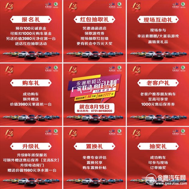 8月15日店慶專場限時(shí)團(tuán)購會(huì) 【活動(dòng)主題】永通斯柯達(dá)十三周年店慶·廠家聯(lián)動(dòng) 瘋狂讓利 【活動(dòng)時(shí)間】2020年8月15日 【活動(dòng)地點(diǎn)】湖南永通斯柯達(dá)展廳 【報(bào)名熱線】0731-88158000 活動(dòng)當(dāng)天驚喜連連。!  【歷年店慶戰(zhàn)況】