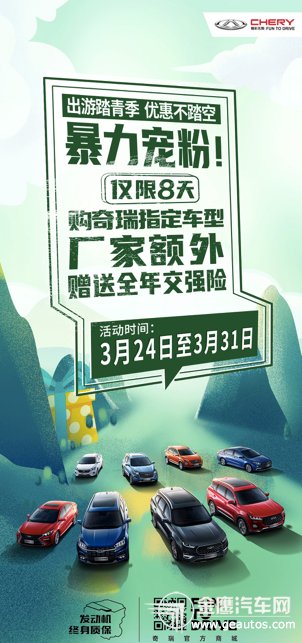 春風(fēng)十里,綠柳如煙,花開兩岸,勝卻人間無數(shù)美景。近日,為助力消費者更舒適的踏青出游,奇瑞汽車攜兩大重磅福利震撼來襲,分別為“全系車型發(fā)動機(jī)終身質(zhì)保”,以及在3月24日-3月31日期間,購奇瑞指定車型廠家額外贈送全年交強(qiáng)險。