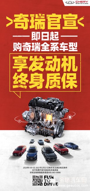 “全系車型發(fā)動機(jī)終身質(zhì)!备@采w奇瑞汽車品牌旗下瑞虎8系列、瑞虎7系列、瑞虎5x系列、瑞虎3x系列、艾瑞澤系列等熱銷車型以及后續(xù)上市的所有車型。此外,為了進(jìn)一步回饋廣大用戶,針對2020年1月1日-2021年2月21日已購買上述車型的用戶,符合相關(guān)條件,即可將愛車免費升級為發(fā)動機(jī)終身質(zhì)保。
