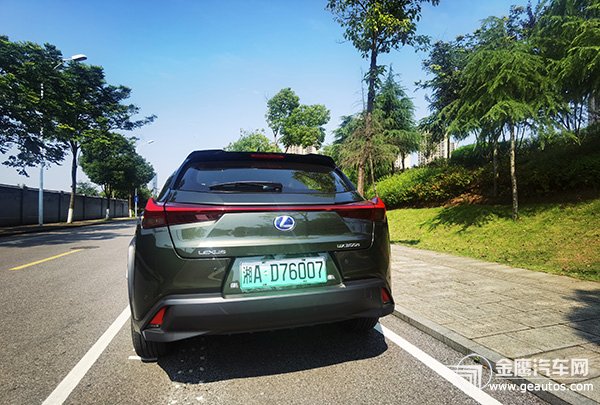 雷克薩斯UX300e的新能源元素在車側(cè)后門上的“ELECTRIC”標(biāo)識、車尾處的藍(lán)色“300e”車標(biāo)以及矩形的充電口蓋板。當(dāng)然還有綠色的新能源車牌。