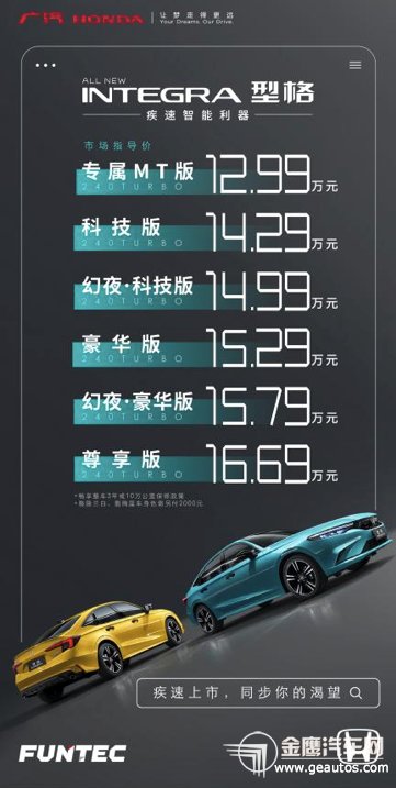 【獨(dú)特幻夜版】 為打磨極致操控,新車(chē)配備18英寸切削輪轂以及運(yùn)動(dòng)型輪胎。整車(chē)采用低重心設(shè)計(jì),更具運(yùn)動(dòng)潛力,底盤(pán)經(jīng)過(guò)精細(xì)化運(yùn)動(dòng)調(diào)校,采用低摩擦技術(shù),輕量化高剛性鋁合金副車(chē)架,塑造扎實(shí)運(yùn)動(dòng)的底盤(pán)表現(xiàn),帶來(lái)夢(mèng)寐以求的激情駕馭。贏得了專(zhuān)業(yè)賽車(chē)手的贊嘆:“感覺(jué)戰(zhàn)神復(fù)活了!”  【全新型格(INTEGRA)疾馳于路上】 型酷格調(diào)“限定”,解鎖潮流密碼 全新型格(INTEGRA)采用簡(jiǎn)銳潮酷設(shè)計(jì),格調(diào)魅力令人怦然心動(dòng)。新車(chē)簡(jiǎn)潔犀利的前臉造型極具攻擊性,犀利的三瞳LED前大燈與刀鋒式LED尾燈造型不怒自威,舒展腰線貫穿車(chē)身,型酷簡(jiǎn)銳造型,吸睛指數(shù)爆表。新車(chē)配備包括熾熱黃、翡絢藍(lán)在內(nèi)的6款豐富車(chē)身顏色,其中翡絢藍(lán)車(chē)色為專(zhuān)屬幻夜系列的限量車(chē)色,全年限量2,000臺(tái),氣質(zhì)非凡更出挑。 在Honda Architecture架構(gòu)設(shè)計(jì)理念下,全新型格(INTEGRA)的車(chē)身設(shè)計(jì)完美兼顧超低重心與寬闊視野,實(shí)現(xiàn)視效與功能的完美融合。整車(chē)采用低重心、寬輪距設(shè)計(jì),營(yíng)造出轎跑強(qiáng)抓地力、低趴運(yùn)動(dòng)的視覺(jué)沖擊力;車(chē)頭兩側(cè)導(dǎo)流孔能抑制紊亂氣流,從而降低風(fēng)阻。 激動(dòng)人心的顏值下,是精致、舒朗的車(chē)廂氛圍,帶來(lái)全新的觸覺(jué)、視覺(jué)體驗(yàn)。新車(chē)采用Honda全球獨(dú)創(chuàng)的蜂窩網(wǎng)眼合金出風(fēng)口,拼色真皮座椅、高質(zhì)感材料以及回饋手感舒適的按鍵,觸及之處皆為心動(dòng);極具科技感的10.2英寸彩色TFT多功能全液晶儀表,9英寸彩色智能互聯(lián)屏系統(tǒng),滿足新世代用戶的科技座艙訴求,整潔流暢的儀表臺(tái)布局,營(yíng)造出清爽舒朗的車(chē)廂氛圍;擁有廣闊的玻璃區(qū)域以及低矮車(chē)頭設(shè)計(jì),即便是低重心車(chē)身也能擁有前所未有的寬闊視野。  【舒朗內(nèi)飾布局】 非凡格調(diào)裝備,品質(zhì)出行更帶感。全新型格(INTEGRA)搭載專(zhuān)門(mén)量身定制BOSE豪華音響系統(tǒng)(12揚(yáng)聲器),在BOSE與Honda工程師們歷經(jīng)4年時(shí)間的精心設(shè)計(jì)和專(zhuān)屬調(diào)校下,帶來(lái)身臨音樂(lè)廳般的聽(tīng)覺(jué)享受,讓權(quán)威汽車(chē)媒體直呼:“被音質(zhì)震撼到了,同級(jí)車(chē)型很少見(jiàn)!”。新車(chē)更配備卡片式鑰匙、手機(jī)無(wú)線充電、車(chē)內(nèi)氛圍燈等格調(diào)舒適裝備。每一次“型”動(dòng),皆為心動(dòng)享受。
